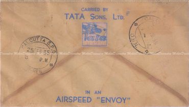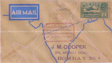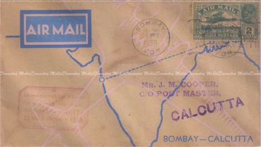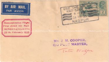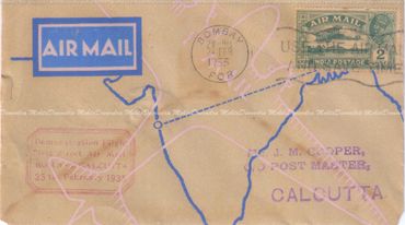 A successful demonstration flight between Bombay and Calcutta took place on the on the 25th of February 1935. The route of flight to Calcutta was via Nagpur and Tatanagar. The return flight to Bombay was via Raipur and Nagpur and was on the 26th of February 1935. The pilot for the flight was Mr. Nevill Vintcent. (An autographed cover of Mr. Vintcent can be seen under the tab 1932 Karachi – Madras Flight)